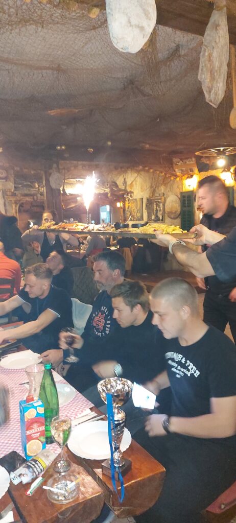 Kao što znate osvojili su igrači iz Samo Zabave, drugi su bili Nenini Manijaci, a 3. ekipa Klizav Pod. Odmah da najavimo kako im neće biti lagano obraniti te titule jer je liga nikad jača. Na večeri su sudjelovali i organizatori Tomislav Petrić i Mario Bilobrk, urednik ove stranice te naš najdraži sudac Ivan Ivković. Prvi su došli dio igrača iz trećeplasirane ekipe, pa zatim i oni koji se Samo Zabavljaju razočarani pomalo rezultatom Hajduka, ali brzo se to zaboravilo te Nenini Manijaci i ostatak Klizavog Poda. Dočekala ih lijepa dekoracija stolova uz već pripremljeno piće, bijelo vino, juice i Coca Cola. Uz vrlo ljubazno osoblje, zabava je mogla početi. Prije same večere podjeljeni su pehari i medalje te nagrade za najbolje pojedince. A oni su sljedeći :
