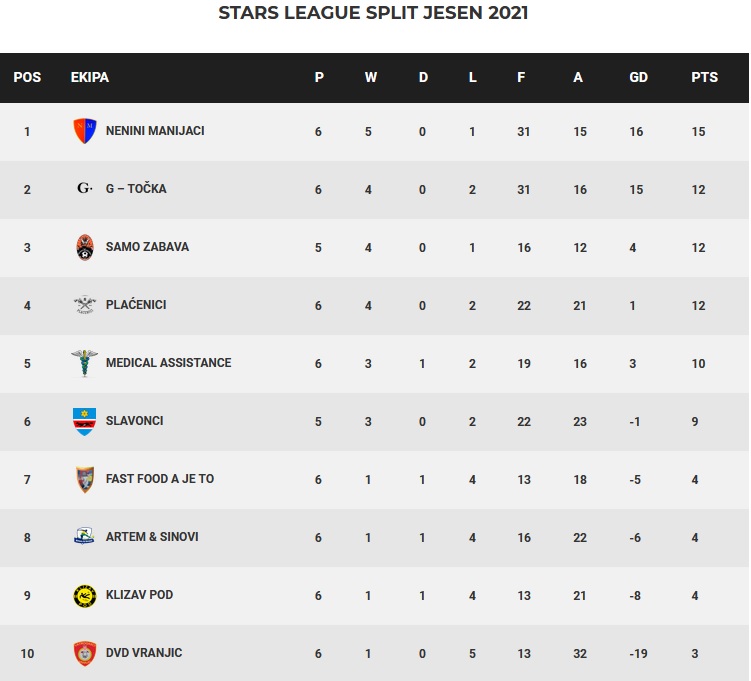 Na 5. mjestu su igrači iz Medical Assistancea koji su krenuli furioznu u STARS ligu i u prva 3 kola bili maksimalni, a nakon toga u sljedeća 3 osvojili samo bod i to protiv ekipe iz donjeg dijela tablice. Njihovi najčesći rezultati su 3:2 i 4:2, jednom 3:3 i 5:2, kao da igraju oba daju i 5+, sigurno je dobra kvota na tu okladu i vjerojatno poslije utakmice trljaju ruke. 🙂 Šalu na stranu, radi se o ekipi iz prošle sezone Vrile kave, koji su za ovu sezonu promijenili ime, ali ne i dresove pa su i dalje najopasniji igrači sa brojem 9, Milan Miki Vodanović, Jadran Ljušaj s pozom 69 i najbolji strijelac regularnog dijela prošle sezone sa brojem 7 Ivan Andrić, a i čekamo njegovog brata Lea da upiše nastup u sezoni Jesen/Zima. Večeras nastupaju protiv Artema, eto im prilike da se vrate na pobjedničke staze.